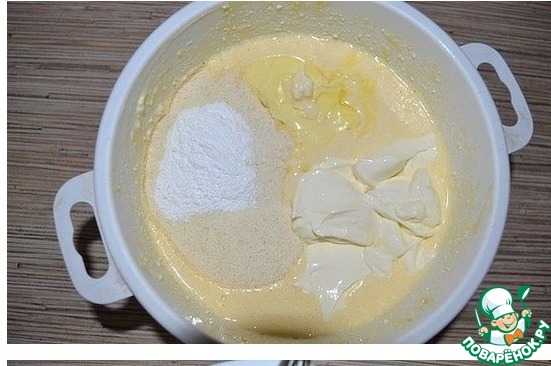 Затем добавим масло, манку, разрыхлитель и сметану. Тщательно перемешиваем до однородности.