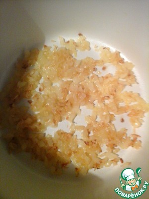 Всыпать в эту же кастрюлю сухой немытый рис и перемешивать его в горячем масле в течение нескольких минут до тех пор, пока рис не станет стекловидным.