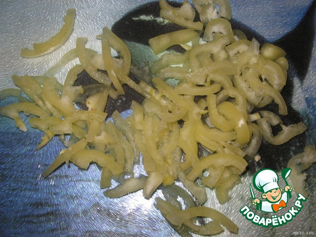 Острый перчик, несколько кружков, режу мелко. Можно его не добавлять, если не любите сильно острое.