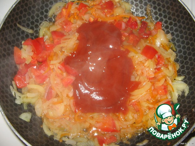 Летом я всегда добавляю помимо томатной пасты ещё и свежий помидор, нарезанный кубиками.