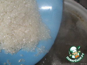 В сварившийся, посоленный бульон отправляем промытый рис.