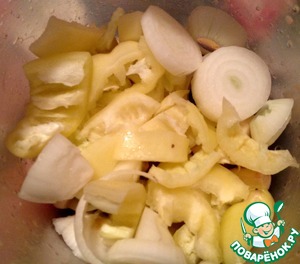 Лук чистим, режем крупными кольцами. Пере болгарский очищаем от семян и режем на несколько частей. Очищаем чеснок.