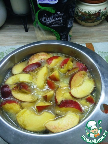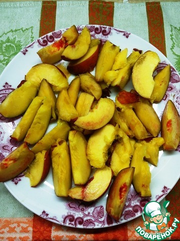 Сначала персики помыть, обсушить, удалить косточки и порезать дольками.