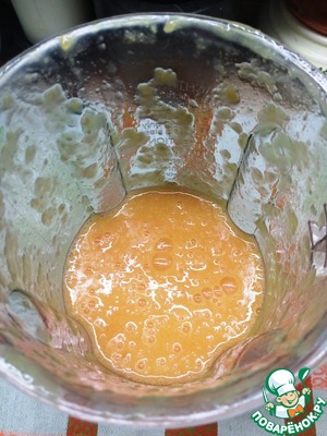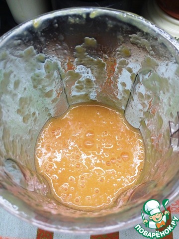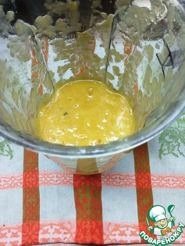 Дольки персиков выловить из сиропа и перемолоть блендером в пюре. Персики у всех разные, не расстраивайтесь если у вас получится пюре сероватого цвета.