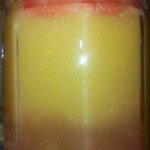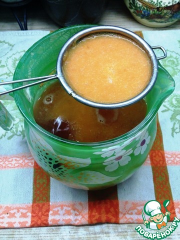 Сироп процедить в кувшин. Персиковое пюре процедить через сито к сиропу. Убрать в холодильник до полного охлаждения.