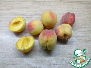 Персики вымыть, обсушить, аккуратно разделить на половинки и вынуть косточку.