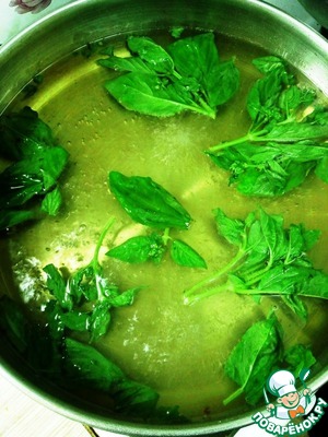 В оставшийся сироп добавить вторую половину пучка базилика и поварить, пока сироп не уварится вдвое.