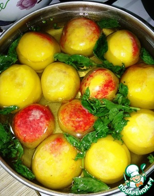 Персики аккуратно положить в сироп, сердцевиной вниз. Поварить 3-5 минут, затем перевернуть на "спинки" и поварить еще 3-5 минут.