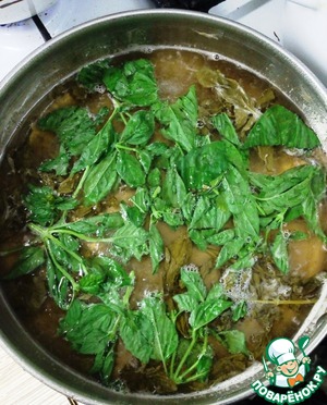 Поставить на огонь, довести до кипения и поварить 5 минут. Базилик вымыть, стряхнуть воду, разделить пучок на 2 части. Одну части положить в сироп.