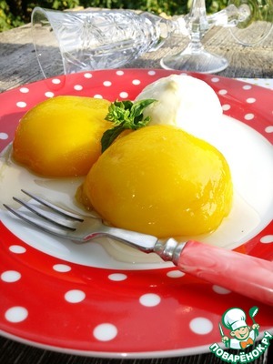 Перед подачей персики выкладываем на тарелки, поливаем сиропом. Еще вкуснее будет, если добавить шарик мороженного.