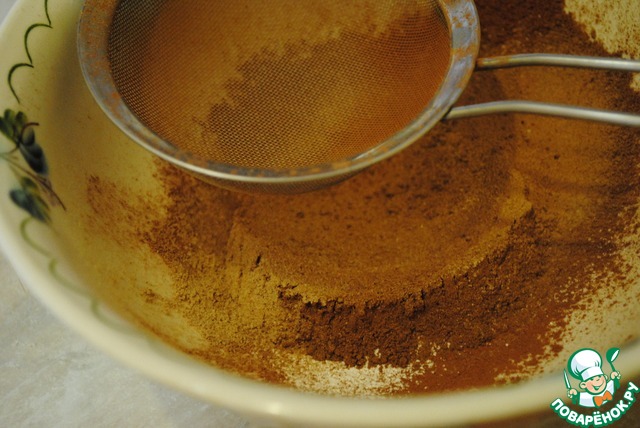 В отдельную миску просеиваем наши специи: какао, корицу, кардамон, мускатный орех, ванилин и имбирь. Сюда же просеваем разрыхлитель и соду. Сода должна быть обязательно, и не бойтесь, она не будет чувствоваться)