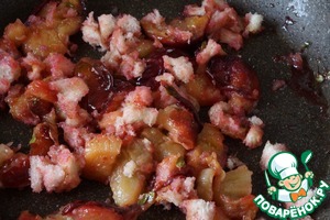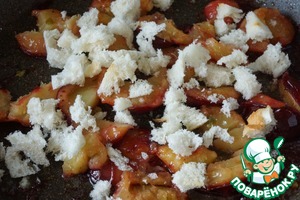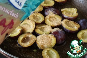 Добавить половинки слив и посыпать их 2-я. стол. ложками тростникового сахара. Потомить сливы минут 5-10, пока они не карамелизуются и на станут мягкими.
