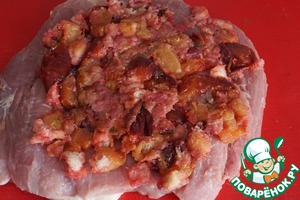Натереть мясо внутри солью, выложить сливовую начинку.