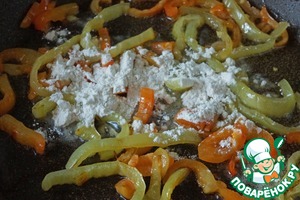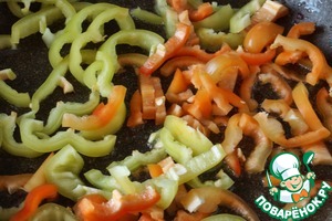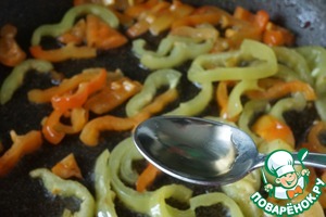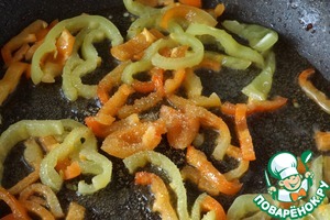 Затем на сковороде разогреть растительное масло и обжарить в нем перец, нарезанный полосками, жарить минут 10.
