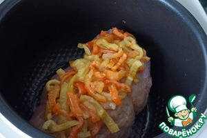 Мультиварку включить в режим "Жарка", время 30 минут. Выложить в неё наш рулет, сверху выложить подготовленный болгарский перец. Через 30 минут включить режим "Тушение", время 1 час.