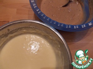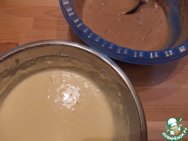 Тесто разделить на 2 части, в одну из них добавить какао, хорошо перемешать.