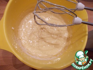 Сливочное масло растопить, остудить. К маслу добавить яйца, 250 мл. молока, 150 гр. сахара ТМ "Мистраль", хорошо взбить, добавить просеянную с разрыхлителем муку, замесить негустое тесто.