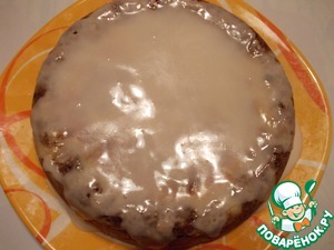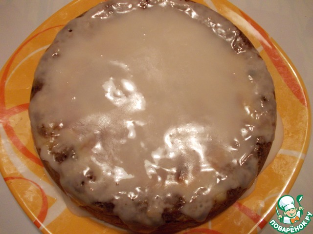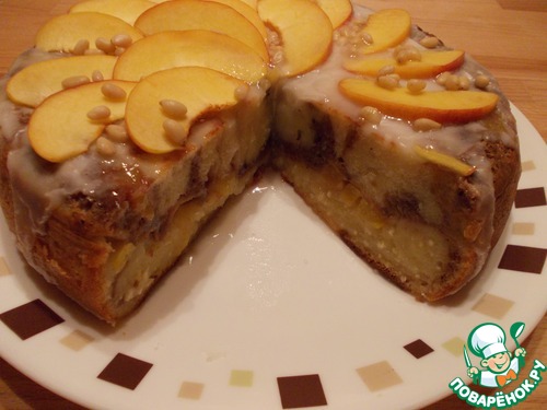 Для глазури. Сахарную пудру смешать с соком лимона. Покрыть пирог. Украсить дольками оставшихся персиков и кедровыми орешками.