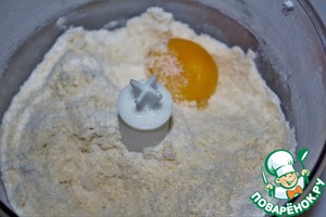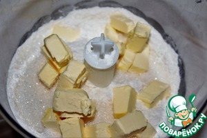 В чашу блендера (используем насадку нож) насыпать муку, соль, сахар, сверху положить кусочки масла. Порубить все до состояния мелкой крошки.