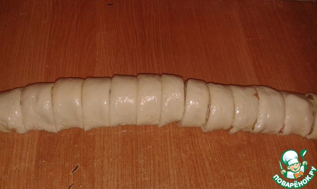 Сворачиваю в рулет и разрезаю на куски приблизительно в 3 см