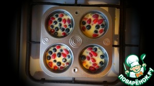 Стараюсь равномерно распределить тесто по формочкам, которые заранее смазала растительным маслом. Стараюсь, чтобы в каждую попало равномерное кол-во ягодок. Лучше всего для этого использовать небольшой половник.