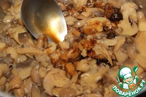 Грибы, лук и чеснок тушить в небольшом количестве масла (1,5 ст. л.) 5-7 минут, в самом конце добавить соевый соус (очень рекомендую - для раскрытия вкуса и аромата), снять с огня и остудить.