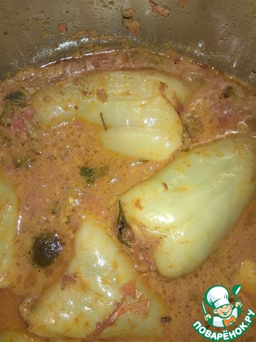 Посолить и поперчить, добавить бульон и довести до кипения. Равномерно распределить соус между перцами. -
