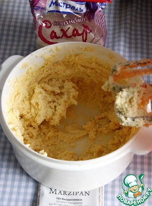 Взбить миксером сливочное масло (или пекарский маргарин) комнатной тем-ры с сахаром и марципановой массы до кремового состояния. Мелкий коричневый сахар от "Мистраль" - идеален для бисквитов и песочного теста.