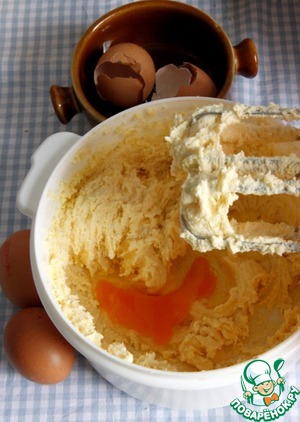 По одному ввести яйца комнатной тем-ры, взбивая массу до гладкости и однородности