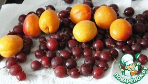Крыжовник очистить по бочкам. Абрикос или подготовленный персик разрезать пополам, вынуть косточку и нарезать дольками (персик) или четвертинками (абрикос).
