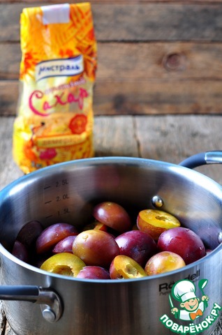 Разрезать на две части, очистить от косточек. Налить 0,5 стакана воды чтобы слива не пригорала, готовить под крышкой до мягкости сливы минут 5-7.