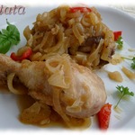 Курицу ( если требуется) разрезать на средние, порционные куски. У меня в этот раз были окорочка ( разрезала на три части), кожу можно снять ( я не снимаю) Лук нарезать крупными кубиками. |