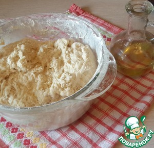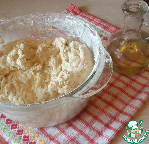 Готовое тесто накрыть крышкой и убрать в теплое место на 4 часа для подъема. Затем на подпыленном мукой столе обмять его хорошо
