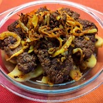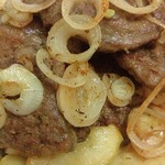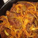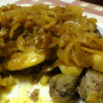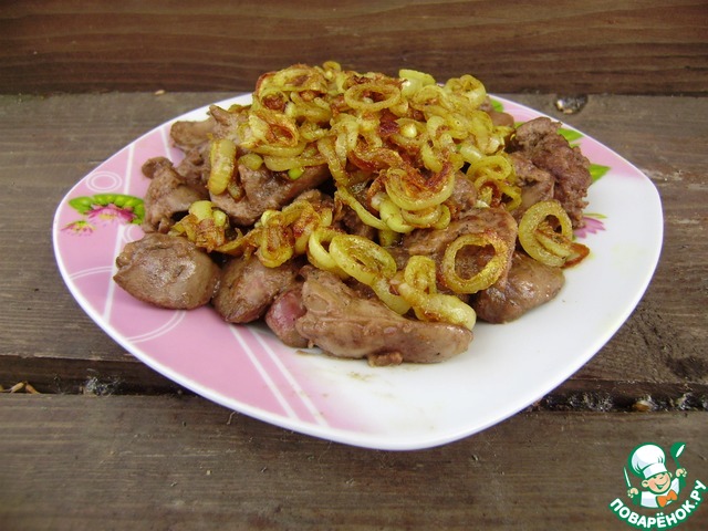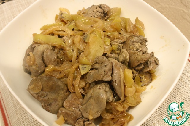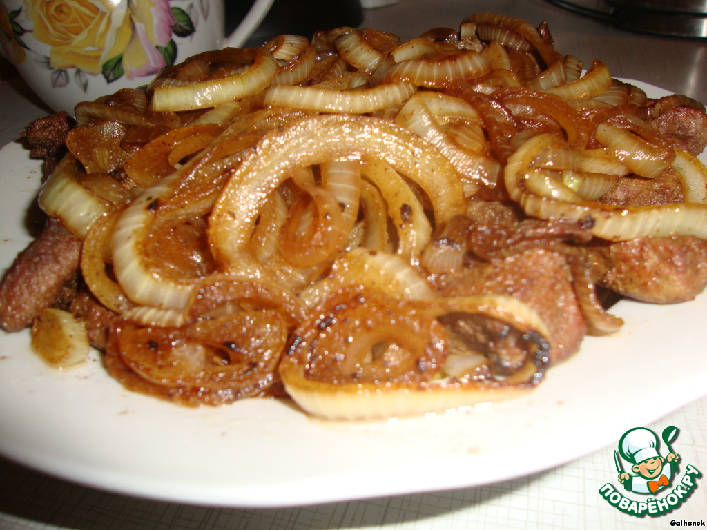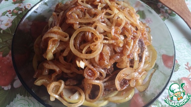 Снимаем, выкладываем лук, нарезанный кольцами, солим, добавляем паприку и карри и, постоянно помешивая, жарим его до состояния, когда уйдет горечь, и он начинает становиться мягче, но еще немножко хрустит, как бы почти до готовности. Лук пропитывается уже печеночно-яблочными соками.