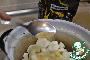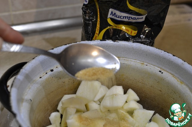 Смешиваем очищенные и нарезанные крупными дольками яблоки с лимонным соком и 1ст. л. сахара у меня тростниковый ТМ "Мистраль, который придаст карамельный вкус яблокам, помещаем в толстостенную кастрюлю, на дно которой предварительно налито 2ст. л воды. И отправляем тушиться на маленьком огне, регулярно помешивая, до выпаривания жидкости.