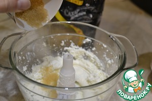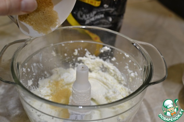 Предварительно доведенный до однородной массы творог (любым удобным способом, я делаю это в измельчителе), смешиваем с сахаром и сливками и взбиваем до полного растворения сахара и получения однородного крема. Плотность крема регулируем сливками, их может уйти больше или меньше, в зависимости от самих сливок и плотности творога.