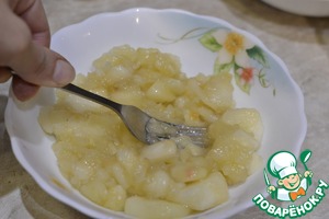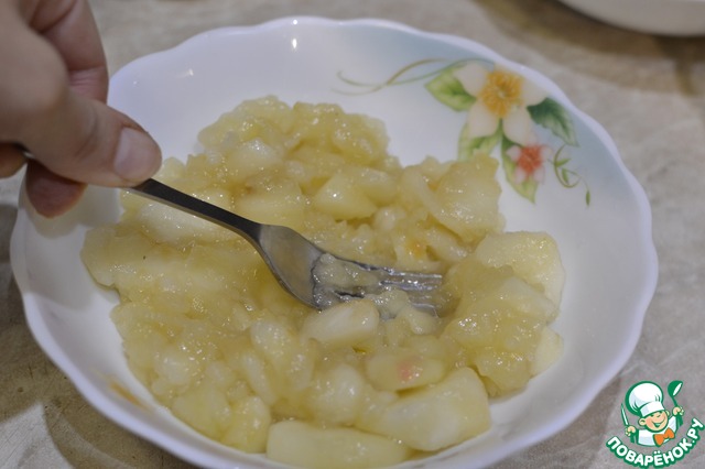 Остуженные яблоки измельчаем вилкой до состояния пюре, ничего страшного, если будут попадаться маленькие кусочки.