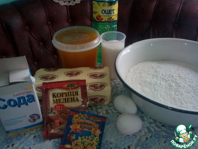 Добавить яйца, мёд, сахар, гашенную соду, ванильный сахар и корицу. Заместить мягкое тесто: оно должно быть однородным, практически не липнуть к рукам.