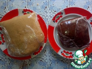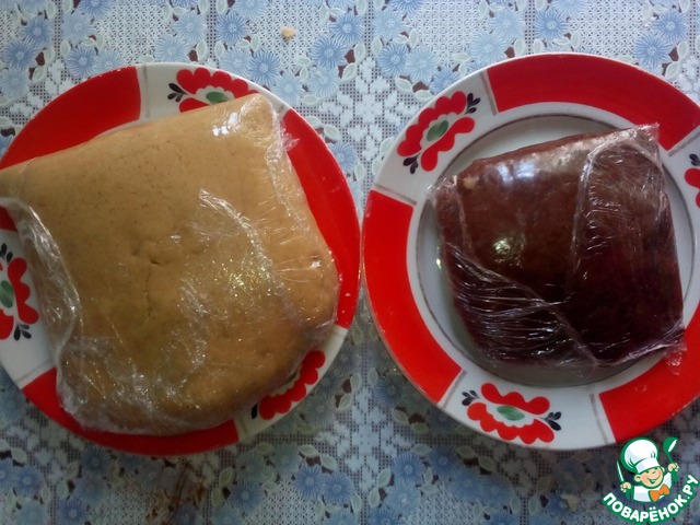 Разделить на три части. К 1/3 добавить какао, хорошо вымесить. Положить обычное тесто и тесто с какао в отдельные полиэтиленовые пакеты или замотать в пищевую плёнку. Оставить на 45 минут, не в холодильнике.