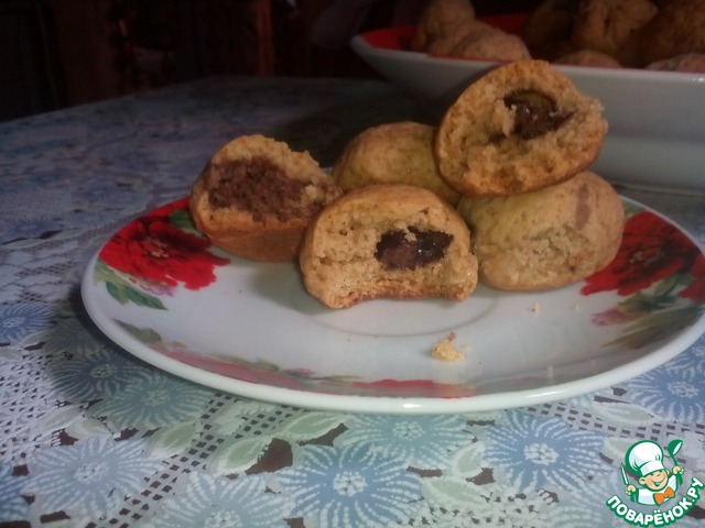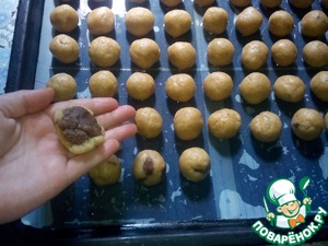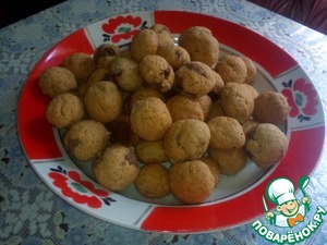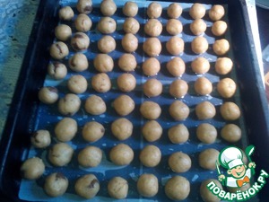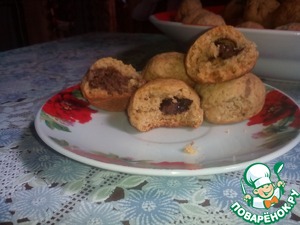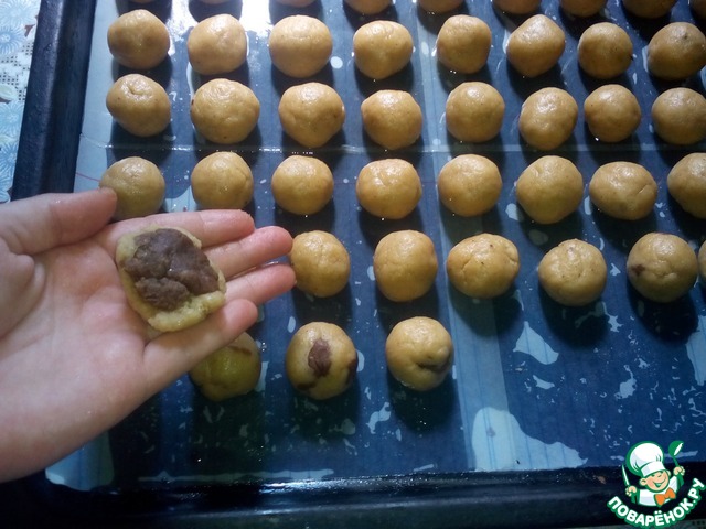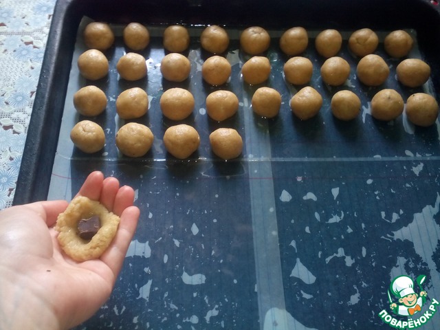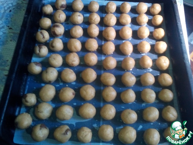 Шоколад нарезать небольшими кусочками. А теперь начинаем лепить печенье: кусочки теста величиною с грецкий орех отрываем от основной массы, формируем 'лепешку', кладем в неё кусочек шоколада и скатываем в шарик. Печеньки выкладывает на расстоянии 1-2 см друг от друга (они немного увеличится в размере), на засланный хорошо промасленной бумагой противень.