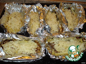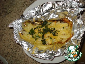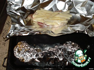 Затем на мясо кладем картошку (прямо из холодильника) и закрываем всё фольгой, не очень плотно.