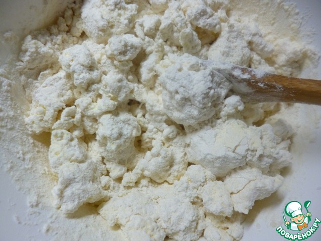 Перемешаем масло, творог и сахар. Добавить муку и перемешивать до образования однородного и очень мягкого теста. Далее выложить тесто на рабочую поверхность, щедро посыпанную мукой, замесить мягкое тесто. Обернуть в пищевую пленку и поставить в холодильник.