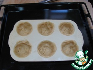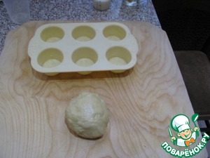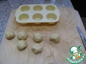 Готовое тесто разделить на шарики и разложить по формочкам диаметром приблизительно 7 см. У меня таких формочек не было и я разложила в формочки для маффин. Но сразу скажу это не лучший вариант, печься будут дольше. Распределить тесто нужно так, чтобы дно было потоньше и высокие бортики.