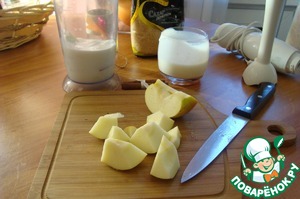 Яблоко чистим от кожуры, режем на четвертушки и убираем серединку. Режем небольшими кубиками, отправляем в кружку блендера. Наливаем туда же кефир 100 мл и хорошо яблоко разбиваем