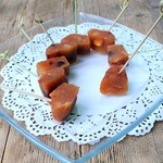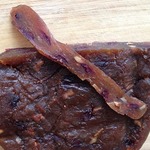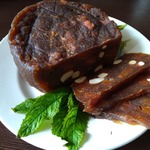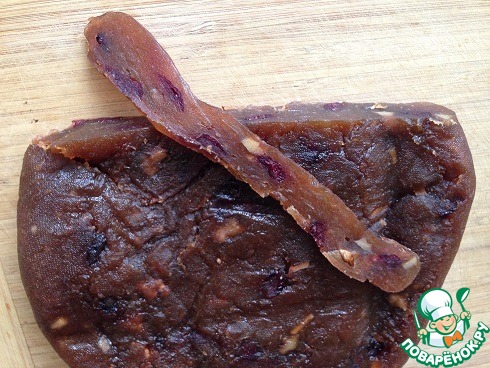 Берем тарелку, выкладываем на нее бамбуковые палочки в виде решетки. Разворачиваем сыр и выкладываем его на нашу решетку, в открытом виде сушим его. В оригинальном рецепте сыр выкладывают на пергамент и в процессе сушки сыр периодически переворачивают, но мне данный способ показался утомительным, на решетке он проветривается и сверху, и снизу. Точных указаний, сколько именно сушить сыр, нет. Я думаю, что здесь очень многое определяется степенью уваренности и толщиной яблочной массы. В моем случае сыр сушился 5 дней. В процессе сушки сыр должен стать упругим и плотным.