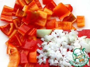 Перец нарезать средними кусками, так, чтобы было удобно потом взять кусочек на вилку. Лук нарезать мелко или как вы любите. Чеснок мелко нарезать, я рублю чеснок в блендере, пульсирующим нажатием, так, чтобы оставались кусочки, но не до каши.