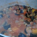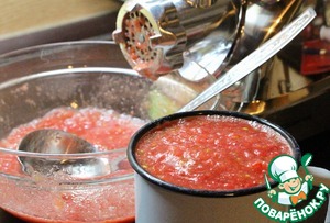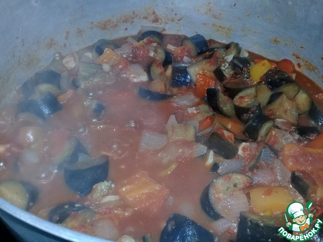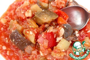 Томаты проворачиваем в мясорубке вместе со шкуркой, нам нужно получить 2 литра массы. Провернутые томаты выливаем в большую емкость для варки и кипятим 7 минут. В прокипевшие томаты добавляем растительное масло, соль, сахар, засыпаем нарезанные лук, баклажаны и перец, варим 15 минут.