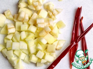 Через 15 минут добавляем яблоки, нарезанные мелкими кусочками, перец чили, нарезанный кусочками. Для тех, кто не любит сильно ядреного вкуса, свежего перца чили можно положить поменьше. Порой при приготовлении блюд у меня остается не использованный горький перец, я нарезаю его на длинные полоски и сушу при комнатной температуре, а затем использую эти полоски при приготовлении блюд. На этот объем овощей я добавила три полоски заготовленного горького перца.