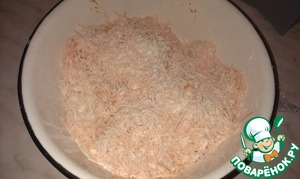 • Вливаем содержимое в морковно-мучную смесь. Тщательно мешаем, лучше используя миксер.