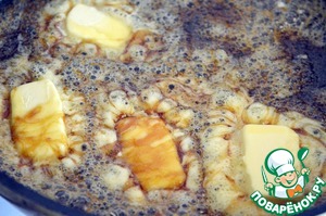 Вводим в карамель сливочное масло (25 г) и затем теплые сливки. Доводим до однородности чтобы вся карамель растворилась.